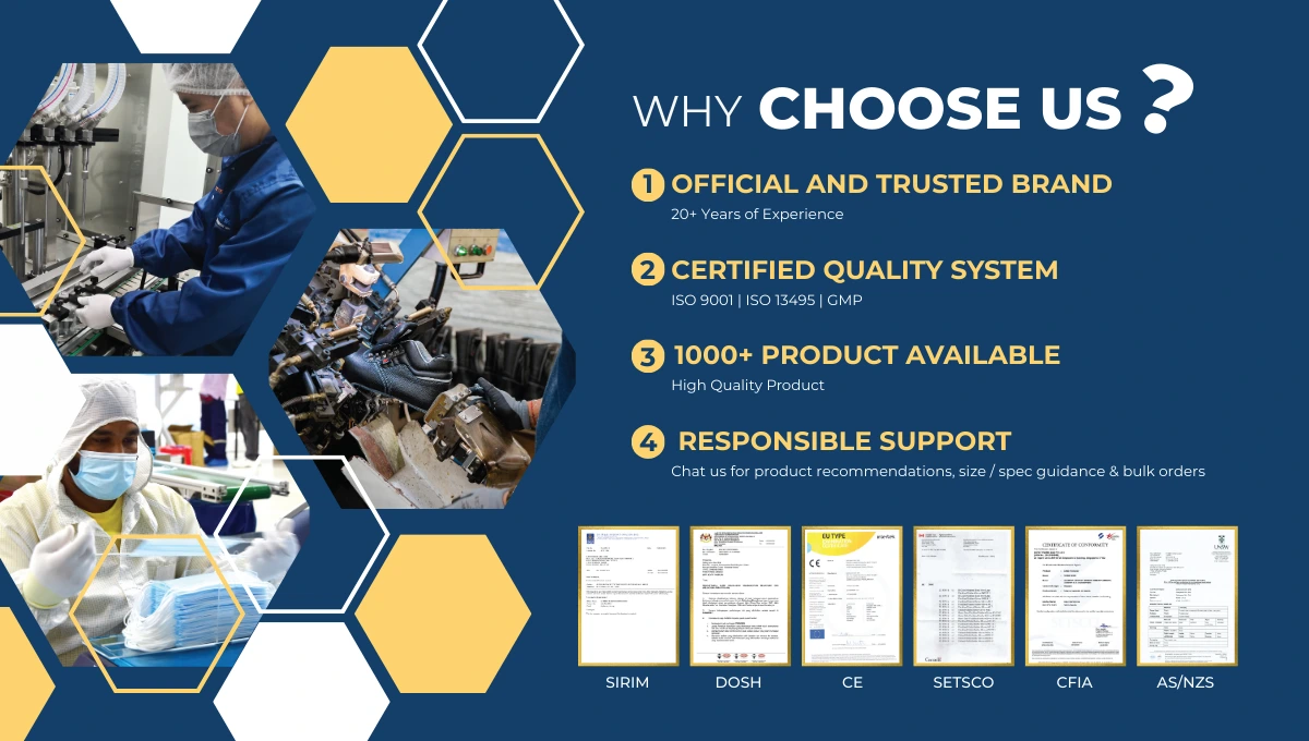 We supply certified PPE like safety shoes, helmets, gloves, respirators, coveralls,