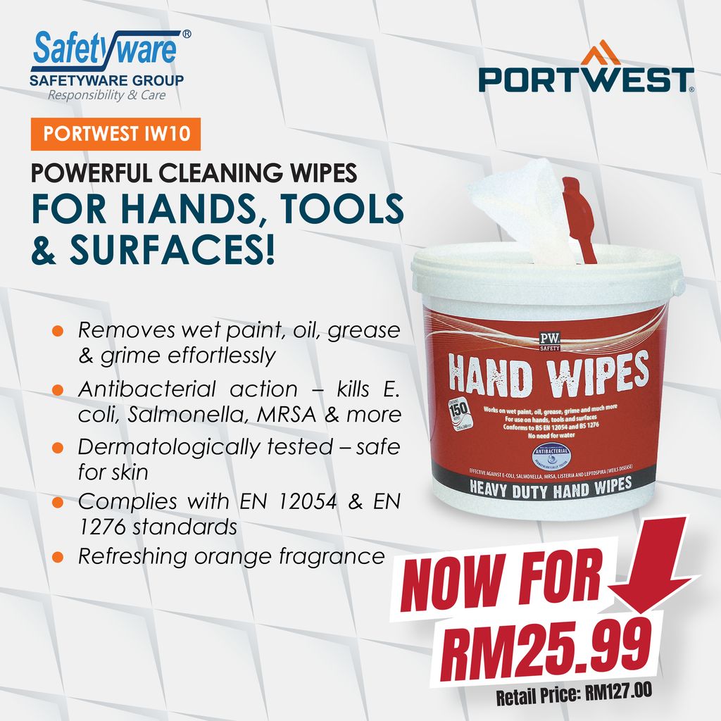 PORTWEST IW10 Heavy Duty Hand Wipes are designed for tough cleaning while being gentle on the skin. These antibacterial wipes effectively remove paint, oil, and grease, making them ideal for industrial and general use.